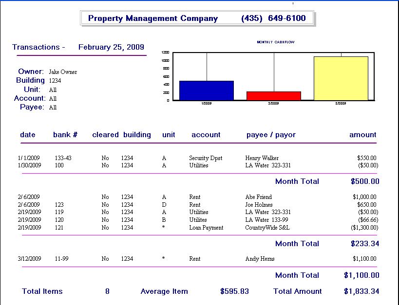 This report shows a Transactions Report... It can be printed for one owner or building or unit for any range of dates. This report is shown on screen and can then be Emailed or Printed if desired. This report is part of the PMplus - Real Estate Property Management Software designed and supported by Realty Software.