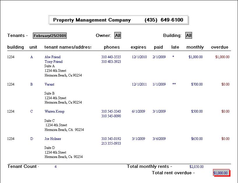 This report shows the current tenant data for a list of the rentals ... in order by tenant name or by building and Unit. Lists of All, Late, Expired or Vacant rentals can be selected for One or All Owners, Buildings and Units. The report is shown on screen and can then be emailed or printed if desired. Tenant Names, Addresses, Phones, Lease Expiration and Paid To Dates and any Late amount are always shown. This report is part of the PMplus - Real Estate Property Management Software designed and supported by Realty Software.