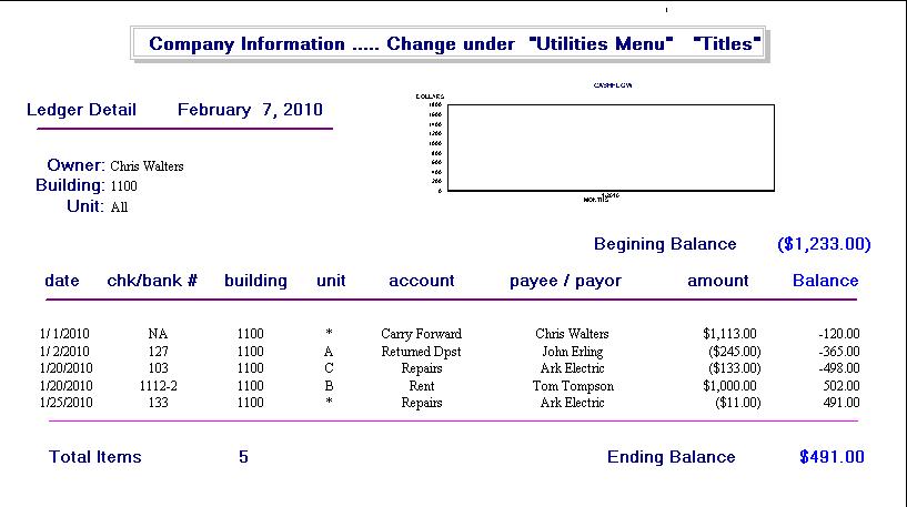 This report shows a typical Ledger for a Property owner ... they can be printed for each Owner for one building or consolidated for all Buildings or even for just one Rental Unit. Any start and stop dates can be specified. A running total shows the resulting Balance after each transaction as well as the Begining and Ending Balance. This report is shown on screen and can then be Emailed or Printed. This report is part of the PMplus - Real Estate Property Management Software designed and supported by Realty Software.