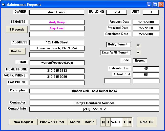 This screen shows all the current data for a given Maintenance Request. When entering a new Maintenance Request as you fill in the Owner, Building and Unit the computer finds the current tenant information and fills in this part of the request for you. You can track request, promise and completed dates, and estimated as well as actual costs. The screen includes a problem discription and contractor information. This report is part of the PMplus - Real Estate Property Management Software designed and supported by Realty Software.