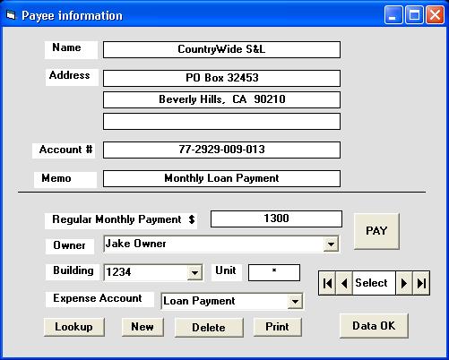 This report shows all the current data for a given Payee. The data above the line pertains to Payees that are paid irregularlly while recurring payment information is below the line. When processing Recurring Monthly Payments this data is used to post the expenses and print the checks This report is part of the PMplus - Real Estate Property Management Software designed and supported by Realty Software.