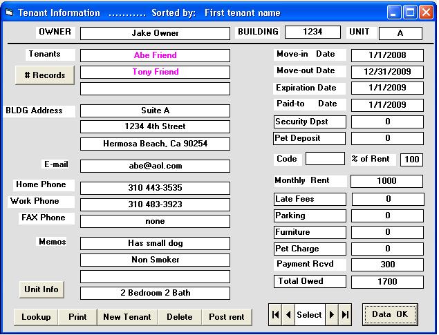 This report shows all the current tenant data for a list of rental ... Even prospective and past tenant data can be saved. The data above the line pertains to the owner and the tenants information is below the line. Extra charges for parking, late fees, etc can be entered here you can charge the names of these accounts. Any partial payments are shown and total owed by the tenant is calculated automatically based on the currnet Paid To Date. Additional information about the rental can be entered under "Unit Info" which opens a notepad file for the rental .... this file is unlimited in size so all kinds of data can be stored about each unit. Rents can be posted directly from this tenant screen with the "Post rent" button at the bottom of this tenant screen. The "Select" control at the bottom of the tenant screen allows the user to search through the tenants in Alphabetic order or the "Lookup" button can find a Tenant directly. All, Late, Expired or Vacant rentals can be selected. This report is part of the PMplus - Real Estate Property Management Software designed and supported by Realty Software.