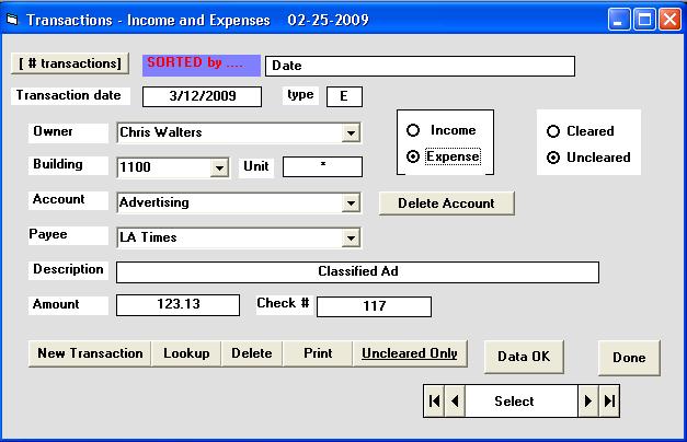 This report shows all the current data for a given transaction. Transactions are automatically sorted by date and by using the "SELECT" control you can look through all transactions. Here transactions can be updated, corrected, deleted or entered with the "New Transaction" button. By clicking the "Uncleared Only" button just transactions that have not been checked as cleared are listed. This report is part of the PMplus - Real Estate Property Management Software designed and supported by Realty Software.